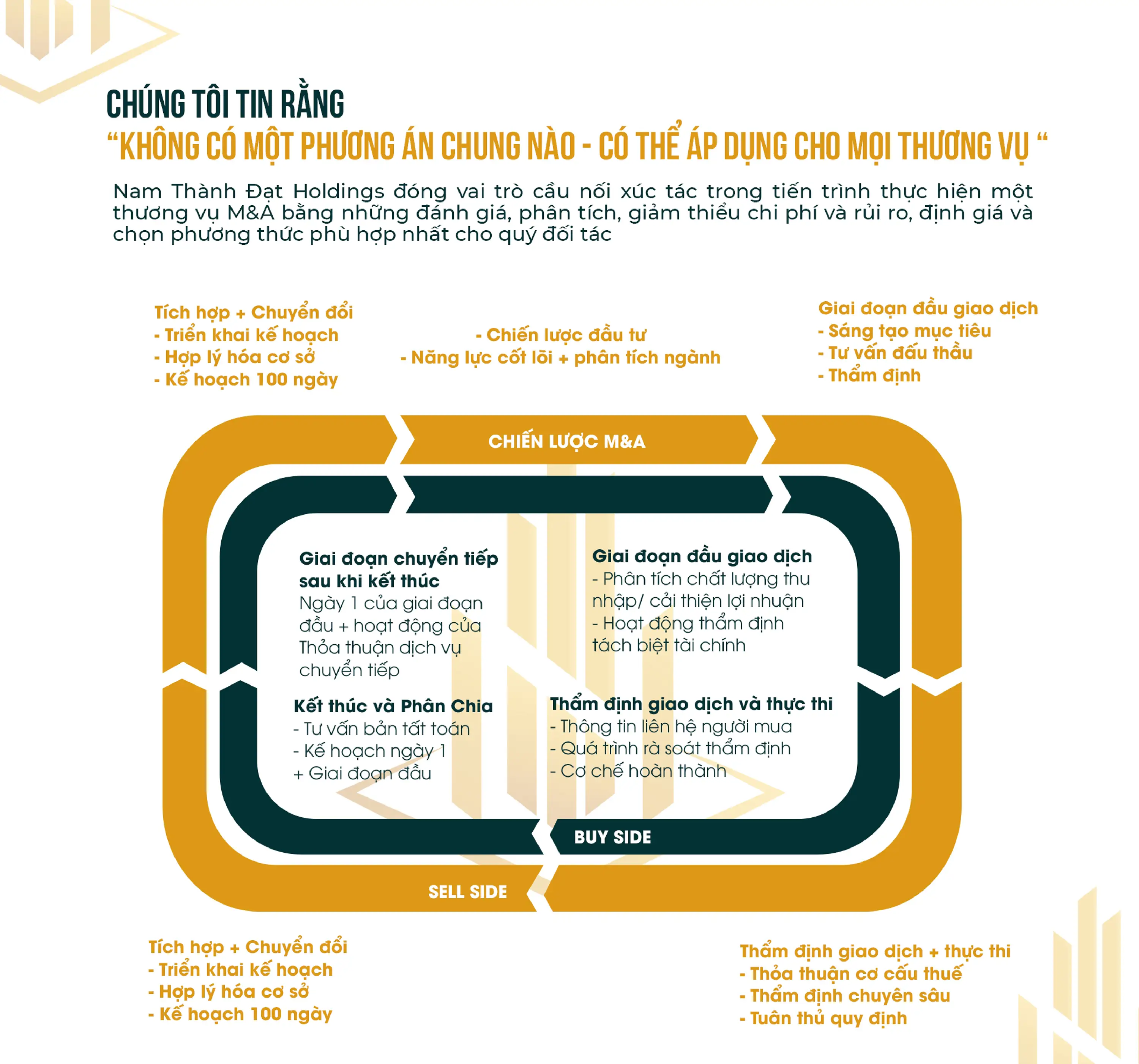 - Nam Thành Đạt Holdings tư vấn trọn gói cho bên mua và nhà đầu tư trong toàn bộ vòng đời của một thương vụ M&A.